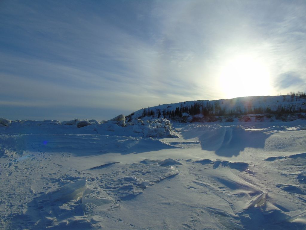 Il arrive souvent que le matin soit brumeux. Un spectacle de toute beauté. Il y a quelques tempêtes de neige accompagnées de fortes rafales de vent pouvant atteindre 50km/h. Ces conditions sont alors accompagnées de bourrasques de neige. La nature se déchaîne. Lorsqu’on sort pour une promenade, on ressent l’eau gelée sur nos cheveux, nos sourcils, les vêtements craquent. Je passe mes fins de semaine à marcher dans la toundra, sur la rivière et le lac.