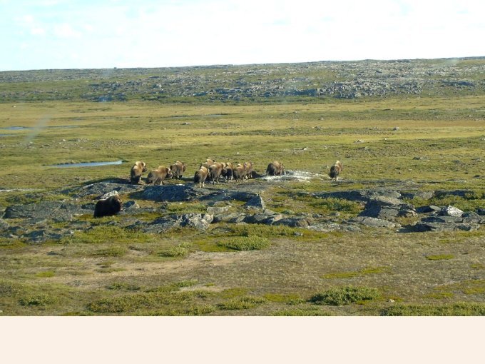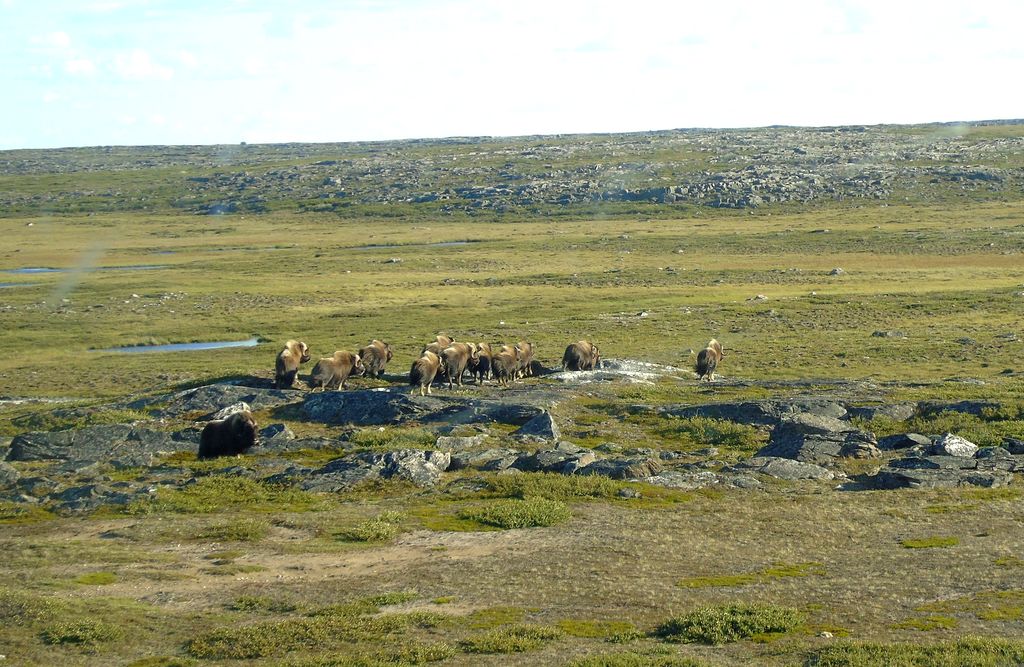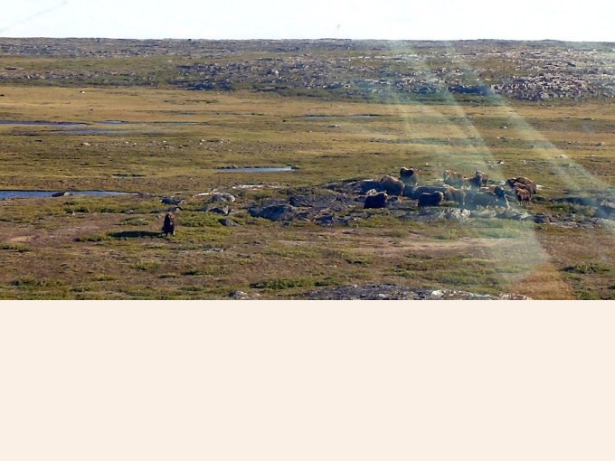 Nous avons la chance d’apercevoir des troupeaux de bœufs musqués. Un gros mâle, pas peureux nous fixe. Le troupeau se déplace. Le mâle nous observe. Il y a des femelles et des bébés. Avec l’hélico nous descendons à leur hauteur, j’ai l’impression que nous sommes si proche. Nous voyons 3 mâles autour du troupeau qui essaient d’attirer des femelles. Le spectacle est grandiose !