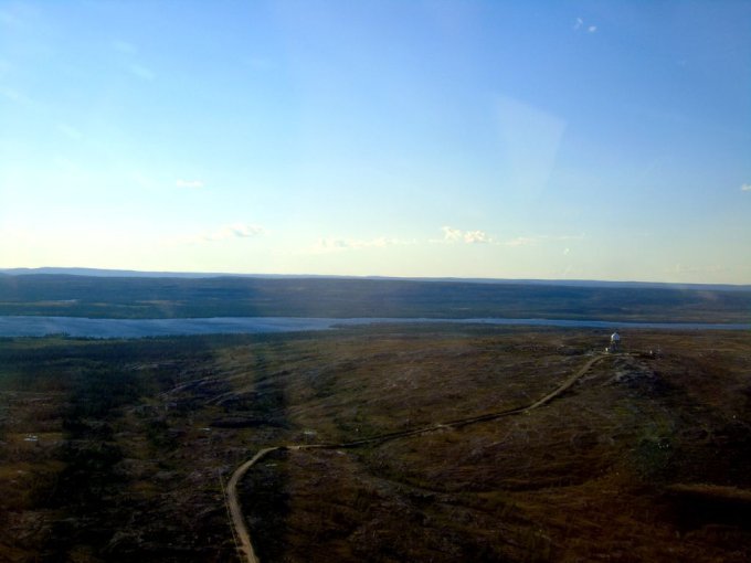 nous longeons le chemin qui rejoint le lieu appelé le plateau, ou se trouve un terrain de golf, qui surplombe la rivière ou s’arrête les bateaux cargos. Je reconnais bien tous ses endroits vu du ciel. Je vois mon logement vue du ciel, le radar et enfin le village de Kuujjuaq puis l’aéroport.