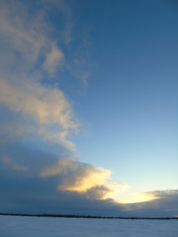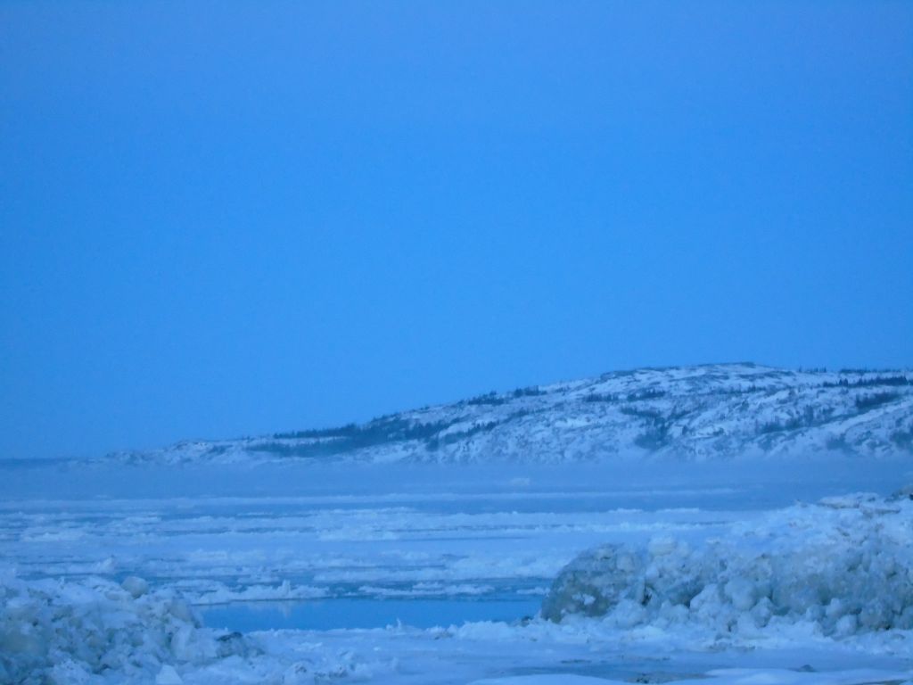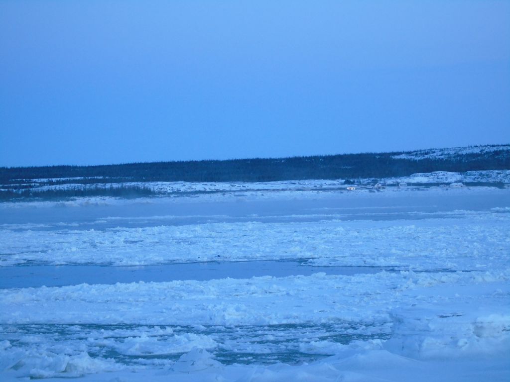 A 14h00, le soleil touchait déjà presque l’horizon. Il faisait froid et la promenade fut courte. On peut imaginer l’immensité de ce lac à quelques kilomètres du village. C’est un lieu de rassemblement pour les habitants de Kuujjuaq. En été, plusieurs habitants y viennent pêcher, faire du canot. En hiver, c’est le lieu pour des courses de motoneiges, pour la pêche sous la glace, pour se promener la fin de semaine.