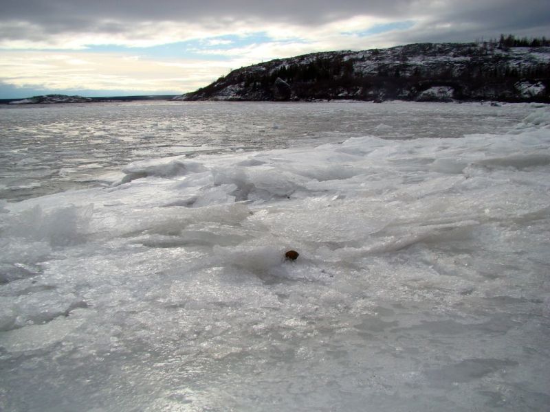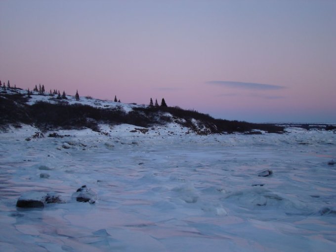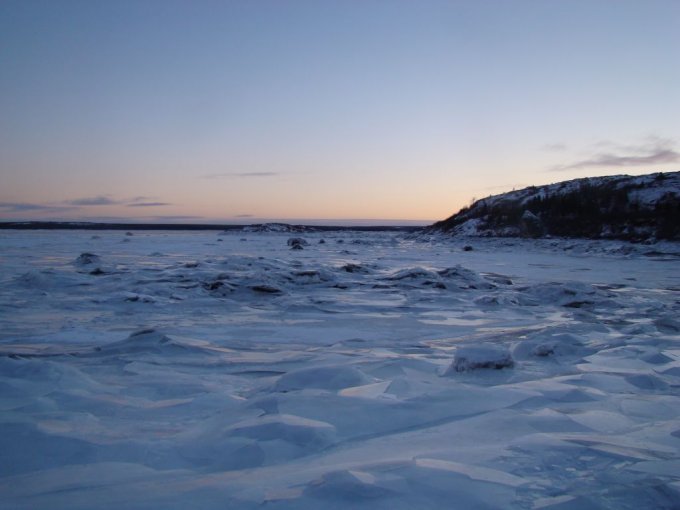 La première belle tempête de neige survient fin octobre. Par une belle journée ensoleillée, nous montons la colline à côté de chez moi. Le paysage est sublime. La glace s’est formée sur la rivière Koksoak. On voit les blocs de glace flotter sur la rivière qui suivent le courant ascendant ou descendant. Je me dis que j’aimerais bien voir à quoi ressemble la baie et la plage à marée basse. Je m’y rends. Splendide ! La marée a formé des blocs de glace au bord de la plage. J’adore le bruit de la glace qui craque au rythme du ressac.