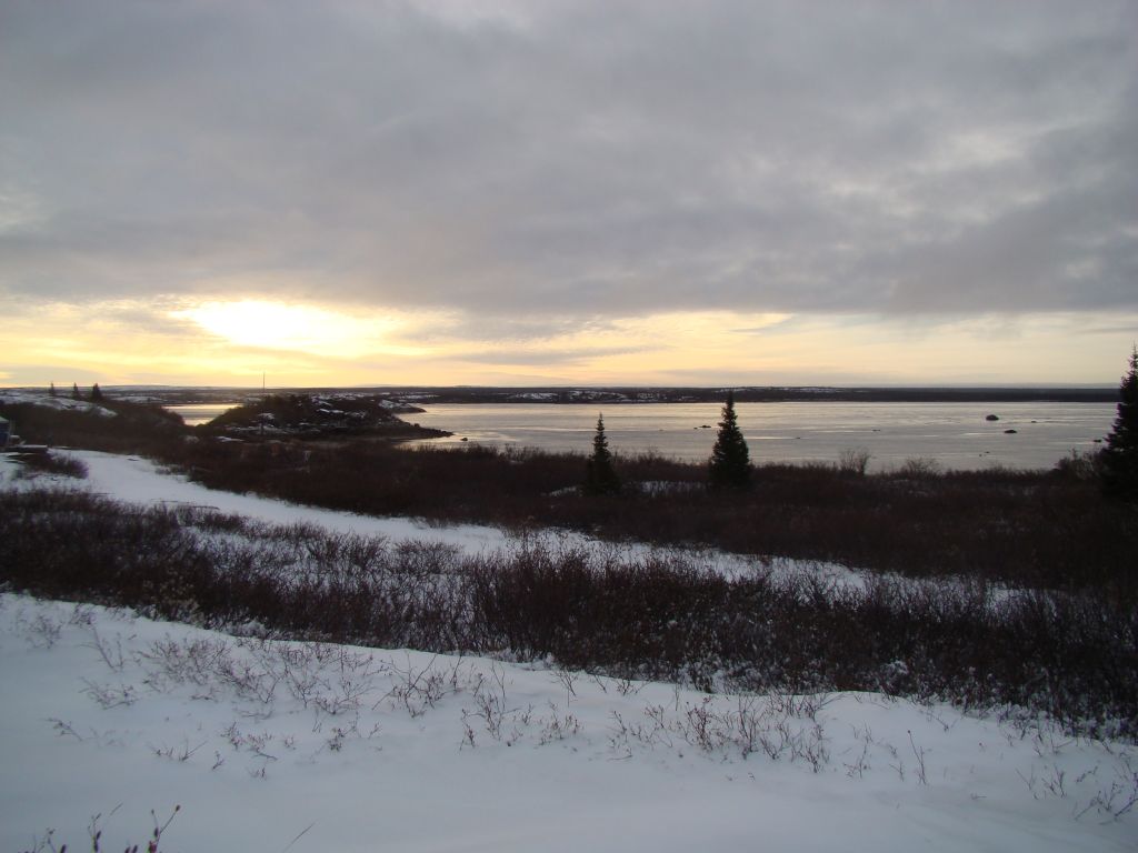 La première belle tempête de neige survient fin octobre. Par une belle journée ensoleillée, nous montons la colline à côté de chez moi. Le paysage est sublime. La glace s’est formée sur la rivière Koksoak. On voit les blocs de glace flotter sur la rivière qui suivent le courant ascendant ou descendant. Je me dis que j’aimerais bien voir à quoi ressemble la baie et la plage à marée basse. Je m’y rends. Splendide ! La marée a formé des blocs de glace au bord de la plage. J’adore le bruit de la glace qui craque au rythme du ressac.
