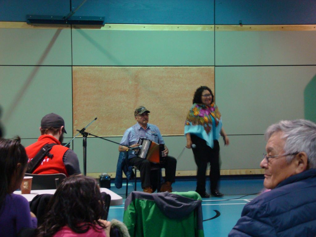 Je participe à deux activités. Dans la semaine un soir, une rencontre dans la salle de musique du village pour jouer du tambour. Nous sommes nombreux. Un beau cercle de tambours se forme. Sous les directives du professionnel, nous jouons. Lorsque deux femmes du groupe commencent à chanter en inuktitut. Elles s’assoient ensemble et font des chants de gorge. Nous les accompagnons aux tambours. C’est magique ! L’une d’elle nous interprète la légende du corbeau et du hibou en chant et en danse.