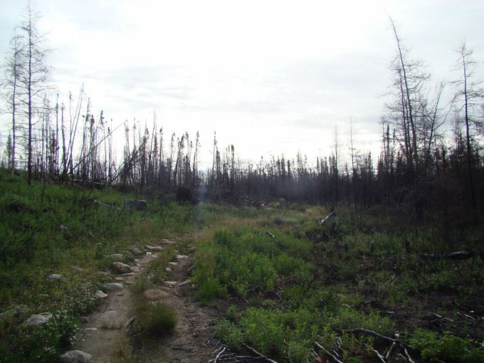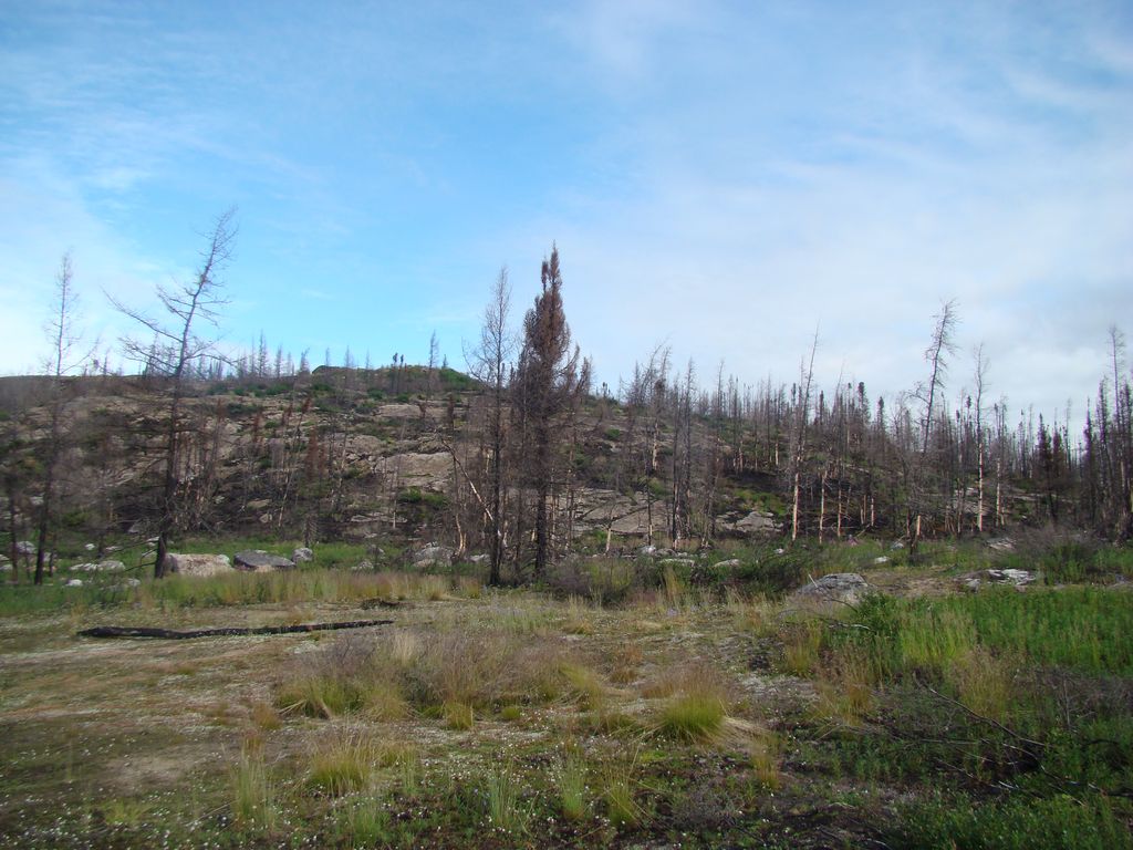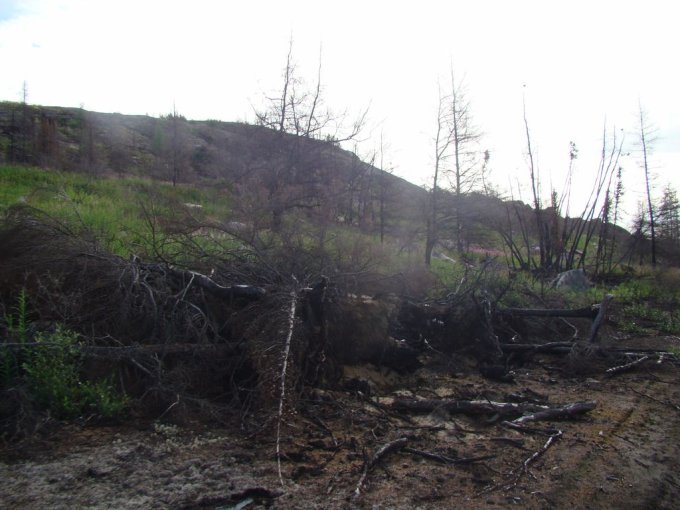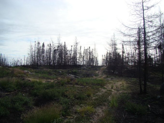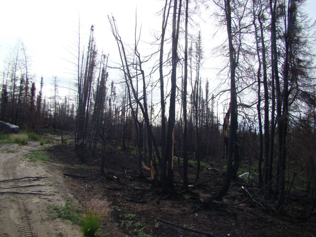 En fait il s’agit d’une partie de forêt, à quelques kilomètres de là, qui a brûlé en partie suite à un gros feu de forêt. Il y a 2 ans il a fait tellement chaud l’été, que le feu est parti. Les pompiers avaient toute la difficulté à l’éteindre. En plus, le chemin pour y aller est assez cahoteux et étroit. Cela ne devait pas être facile.