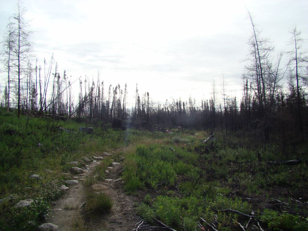 puis au fur et à mesure que nous avançons, tout est noir, gris. Quelques fleurs arrivent à pousser ça et là. La nature reprendra ses droits dans quelques années. On ne peut qu’imaginer l’ampleur des dégâts. Victor me dit qu’heureusement il y avait une butte rocheuse sinon le feu aurait continué vers le village tout près.