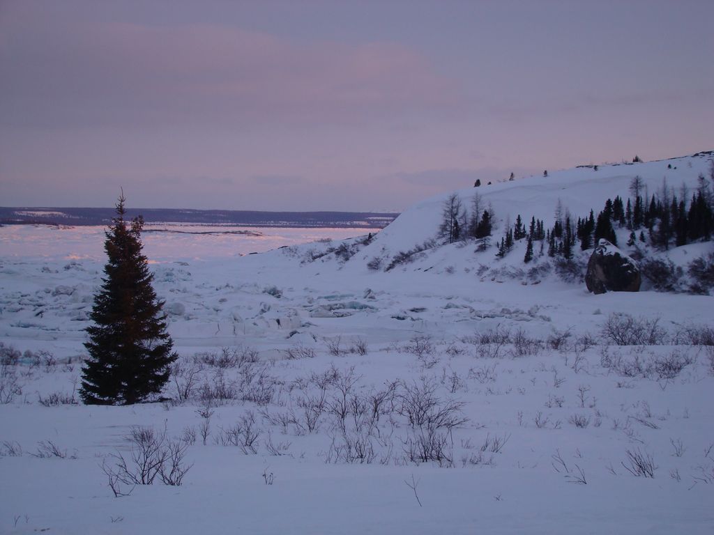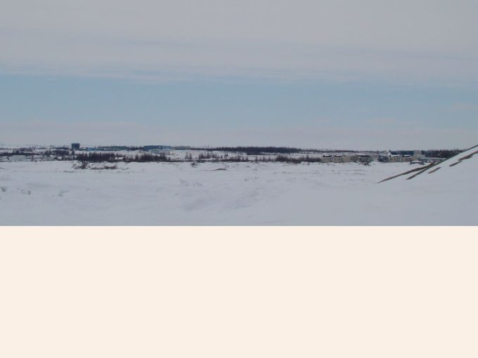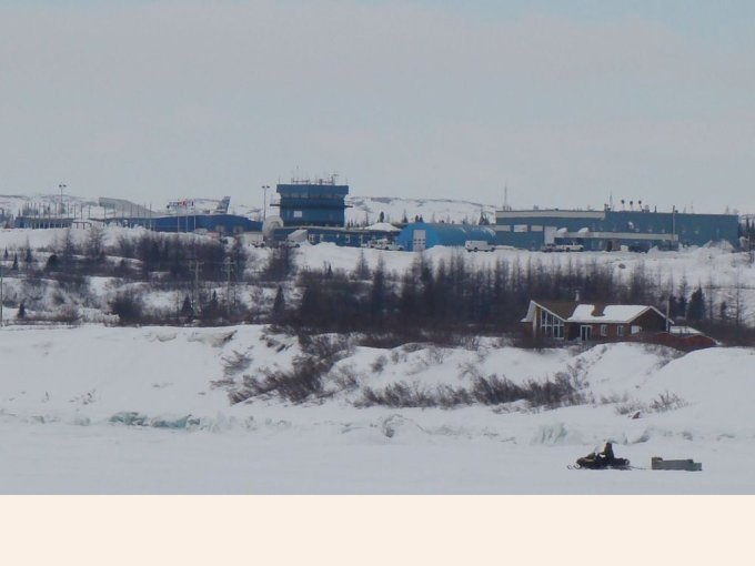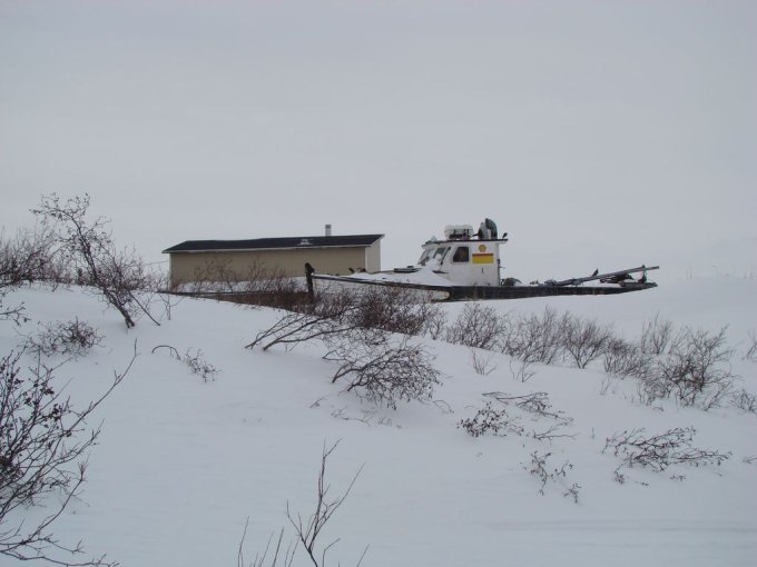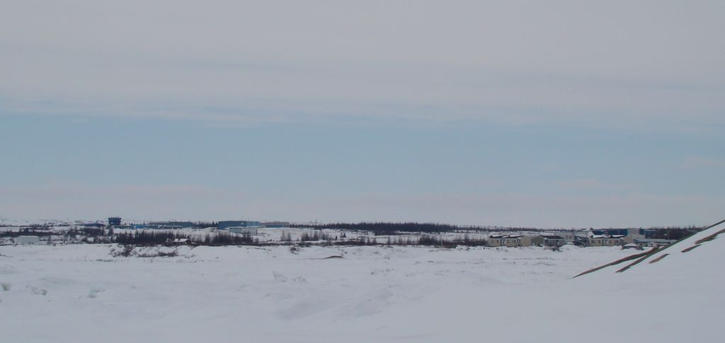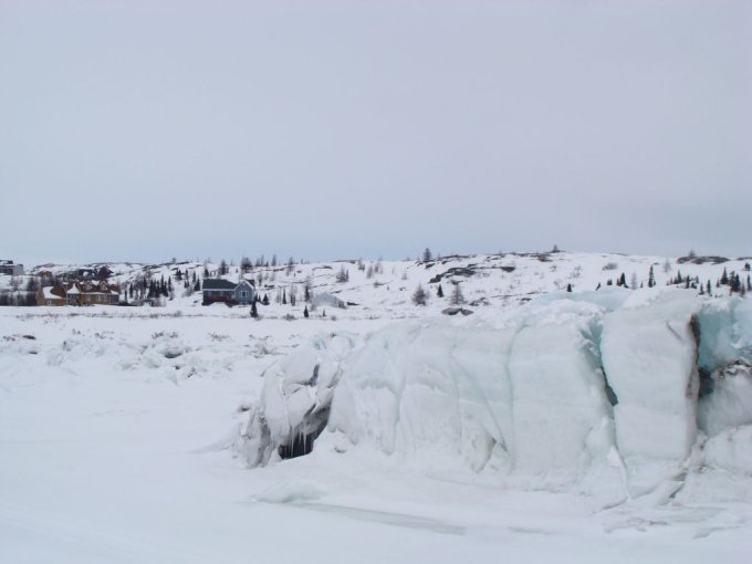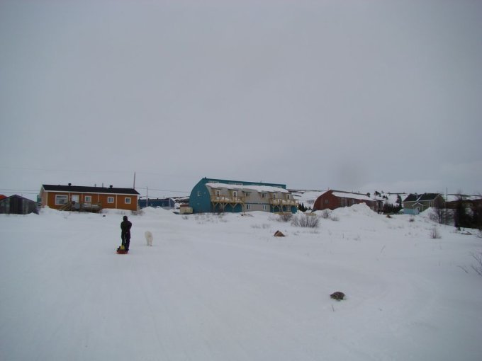 Au détour de la colline, on aperçoit le village de Kuujjuaq au fond. C’est une vue à couper le souffle, on aperçoit l’aéroport, le village, les bâtiments familiers. Nous avançons doucement avec prudence. Beaucoup de personnes sont dehors, il y a des motoneiges sur la rivière. Plus nous approchons du village, plus nous croisons des habitants qui prennent l’air comme nous.