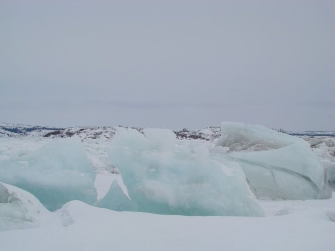 Dès que nous atteignons la rivière, le paysage est magnifique. Les blocs de glace que nous avions vu lors de nos sorties précédentes sont d’un bleu clair splendide !!!